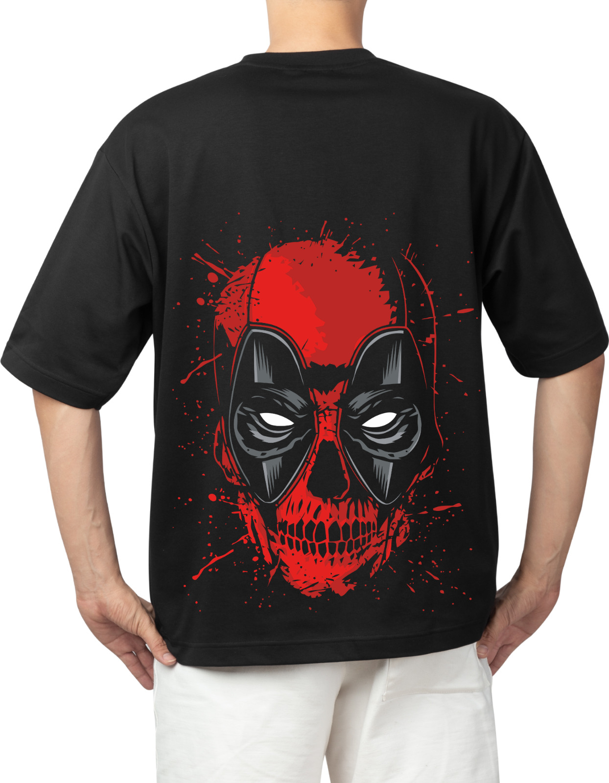 Break the fourth wall and your fashion limits with the Deadpool Mayhem Tee, a tribute to Marvel’s most unpredictable antihero. This black oversized T-shirt features a bold graphic inspired by Deadpool’s chaotic persona — perfect for fans of comic book culture, dark humor, and urban streetwear.